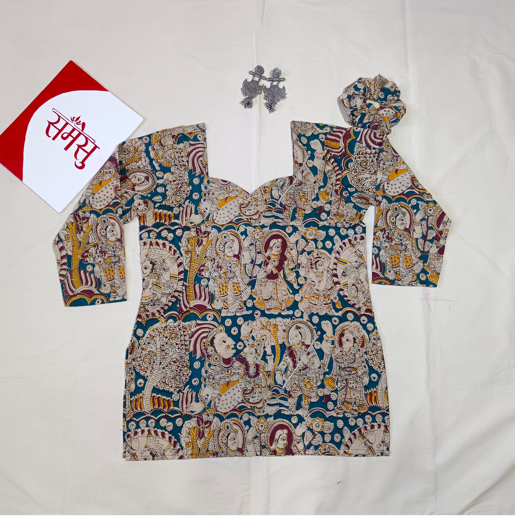 . Short kurti with long sleeves & beautiful kalamkari print on it.